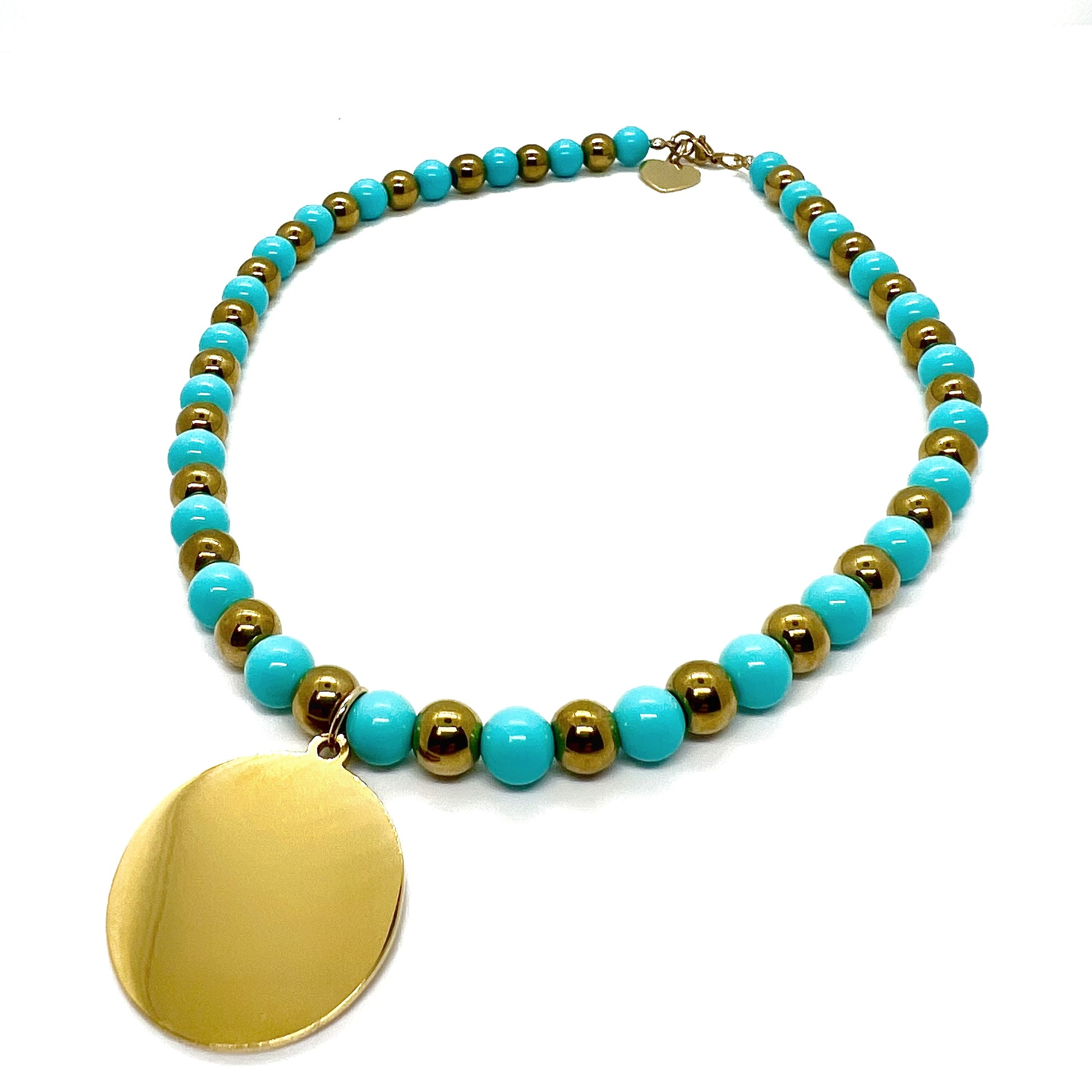 Collana con sfere bicolore e targhetta piattava tonda